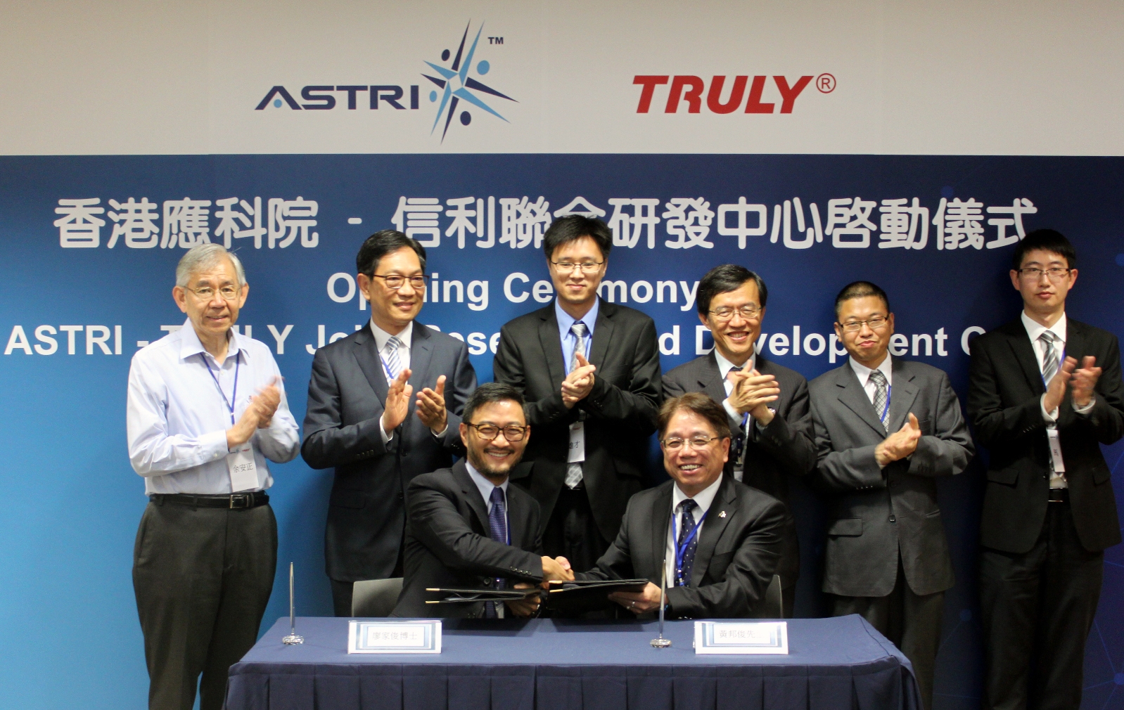 雙方今天特別舉行「香港應科院•信利聯合研發中心」啟動儀式,由應科院署理行政總裁廖家俊博士及信利國際執行董事黃邦俊先生主禮,並由應科院董事局主席王明鑫先生,以及香港特別行政區創新科技署科學顧問余安正教授、信利國際代表謝雄才先生、李孟祥先生、馬亮先生共同見證。
